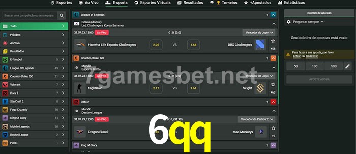 O 6qq oferece uma grande seleção de opções de apostas em e-sports com probabilidades competitivas
